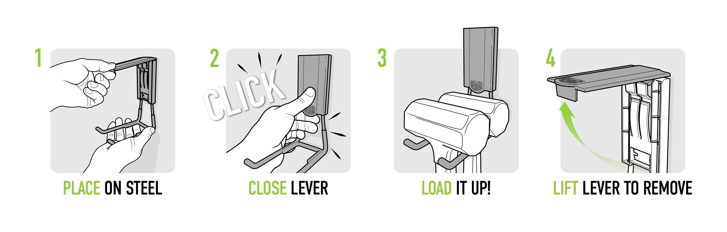 We design and program patterns of north and south poles called "MAXELS", (mash-up of "magnets" and "pixels"), on one surface of each neodymium magnet, creating short magnetic fields that interact, engage, and adhere with incredible load capacities to thin and thick steel surfaces. Then, using our patented Easy-Release Lever System, we have perfected and optimized the hook to hold its load as a hook should, which is at a right angle to the floor, and easily release to move to a new location.